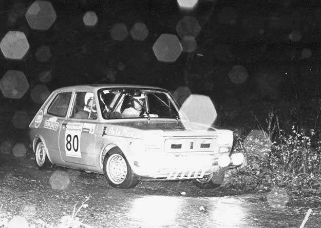Con el 127 que nos prestó Seat Auto Moriz, el mismo con que participaríamos despues en el Firestone. Un rally duro, con tramos de tierra, piedras y baches, 'adornado' con lluvia de esa norteña que llueve y llueve y no deja de llover. Poco que añadir. Creo que íbamos bastante bien, pero... en la última prueba, en una bajada, freno tarde, bloqueo ruedas, patinamos de morro y nos estreallamos contra una valla. ¡En la última prueba! Resultado: adiós y para casa.